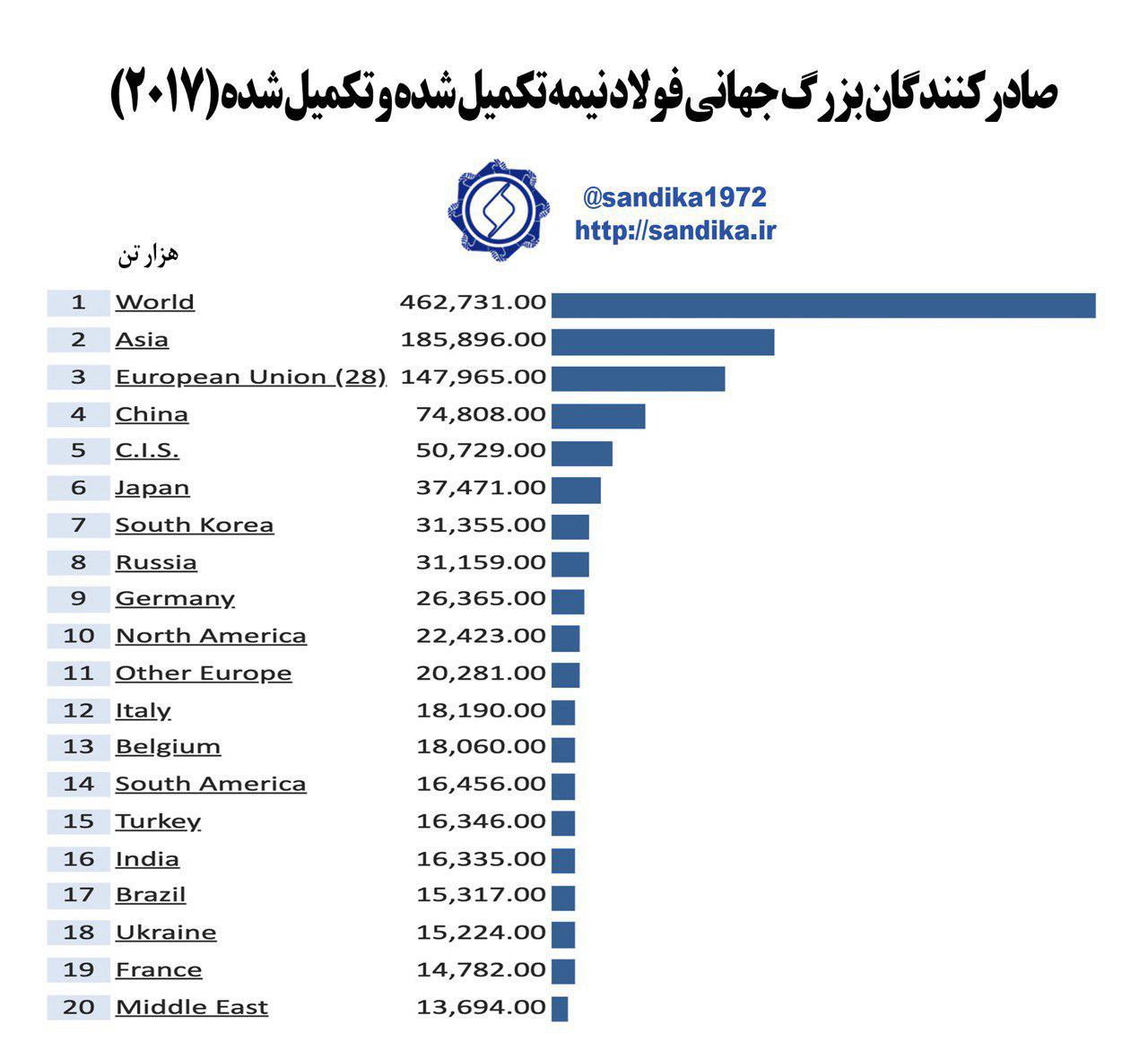 صادرکنندگان بزرگ جهانی فولاد نیمه تکمیل شده و تکمیل شده (۲۰۱۷) @sandika1972 شورای تحقیقات سندیکا #نمودار
