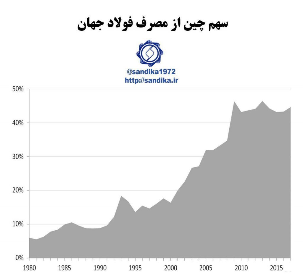 🔸 در ۳۰ سال اخیر، سهم چین از مصرف فولاد جهان، از ۵ درصد به بیش از ۴۰ درصد رسیده است.