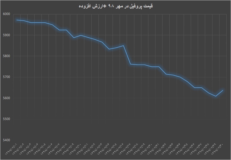 جدول هفتگی قیمت ها / زنجیره فولاد ۱۱ آبان ۱۳۹۸ شناسه خبر : 7126 نمودار قیمت پروفیل فولادی ۲ میل طی مهر ماه ۹۸ با احتساب ۹% مالیات بر ارزش افزوده