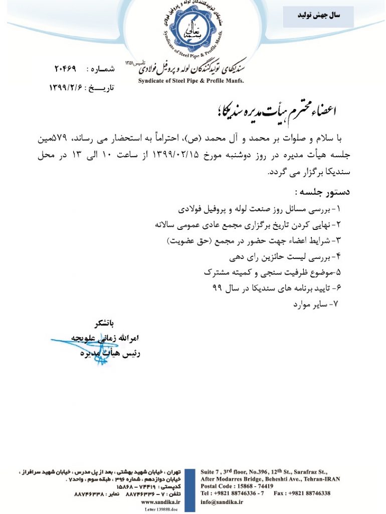 با سلام و صلوات بر محمد و آل محمد (ص)، احتراماً به استحضار می رساند، ۵۷۹مین جلسه هیأت مدیره در روز دوشنبه مورخ ۱۵/۰۲/۱۳۹۹ از ساعت ۱۰ الی ۱۳ در محل سندیکا برگزار می گردد.