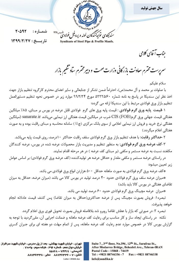 با صلوات بر محمد و آل محمد(ص)، احتراماً ضمن تشکر از جنابعالی و سایر اعضای محترم کارگروه تنظیم بازار جهت اخذ نظر این سندیکا در پاسخ به نامه شماره ۶۰/۵۲۲۲۵ مورخ ۲۴/۲/۹۹ موارد زیر در خصوص نحوه تنظیم دستورالعمل تنظیم بازار ورق فولادی مرتبط با این سندیکا ارائه می گردد؛