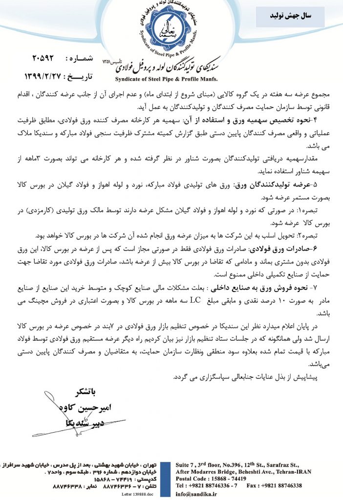 در پایان اعلام میدارد نظر این سندیکا در خصوص تنظیم بازار ورق فولادی در ۷بند در خصوص عرضه در بورس کالا ارسال شد ولی همانگونه که در جلسات ستاد تنظیم بازار نیز بیان کردیم راه دیگر عرضه مستقیم ورق فولادی توسط فولاد مبارکه با قیمت تمام شده بعلاوه سود منطقی ونظارت سازمان حمایت، به متقاضیان و مصرف کنندگان پایین دستی میباشد.