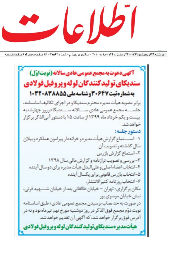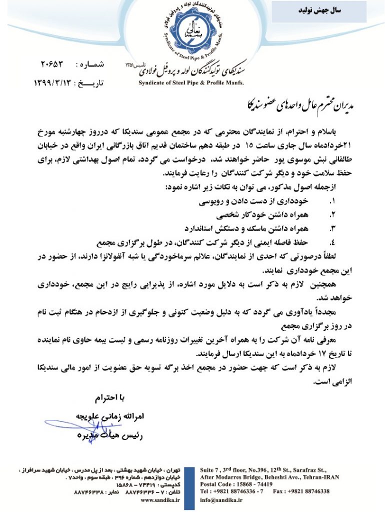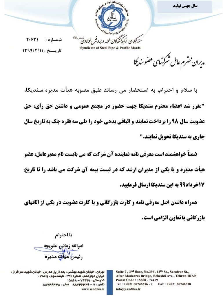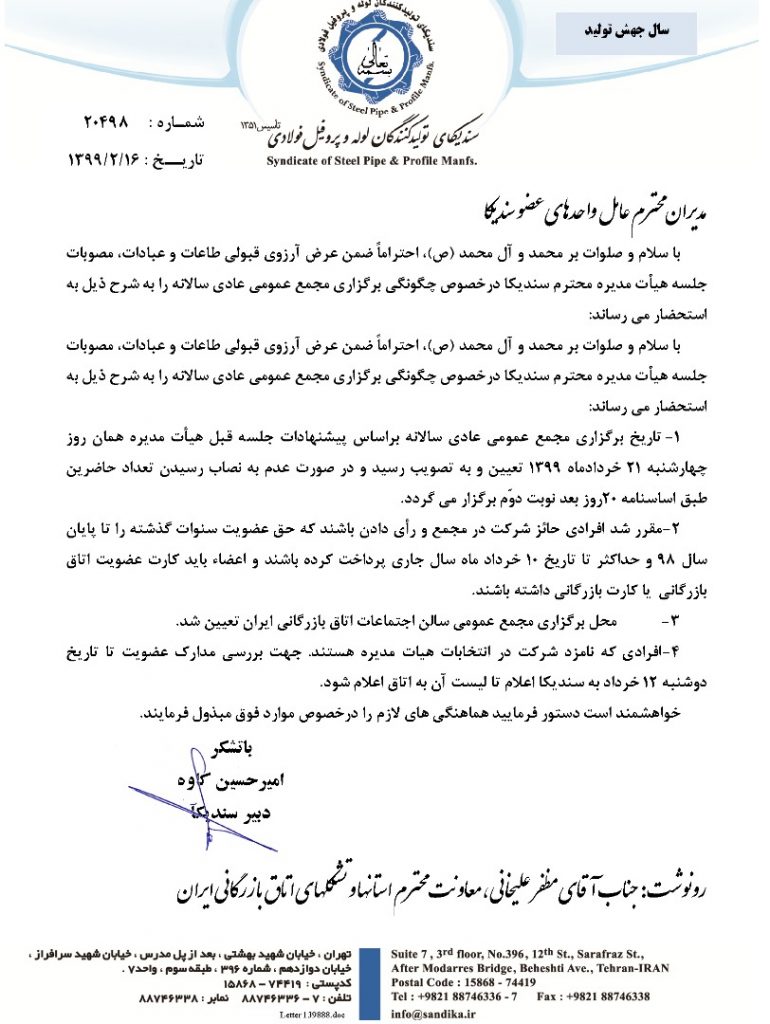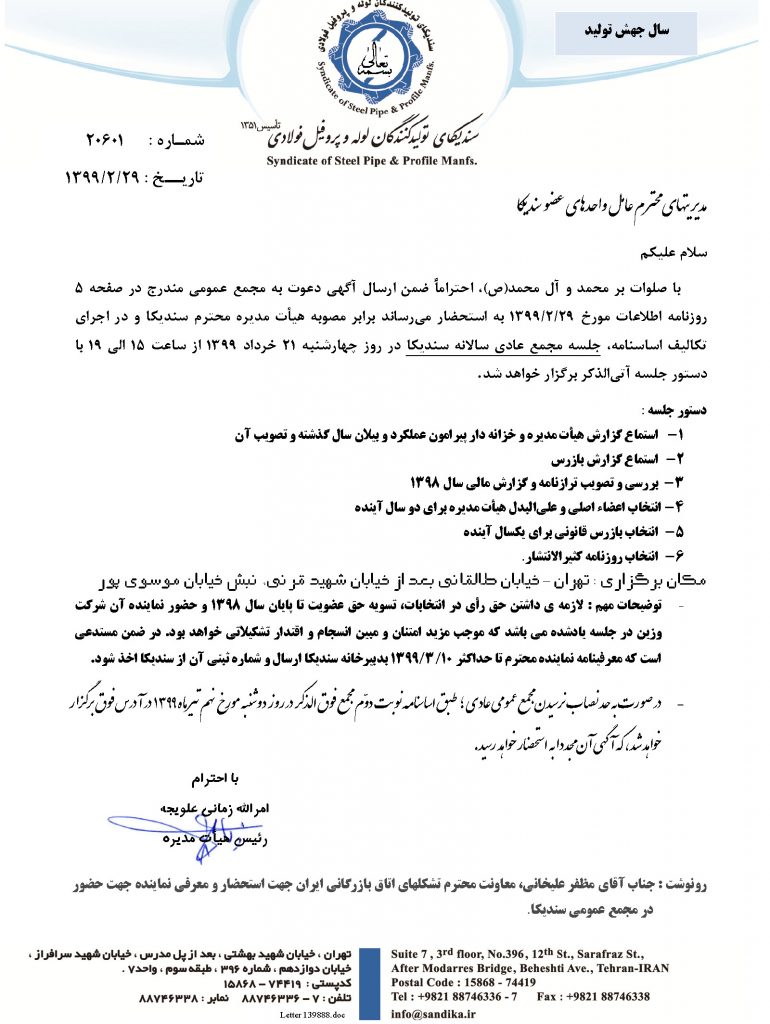 با صلوات بر محمد و آل محمد(ص)، احتراماً ضمن ارسال آگهی دعوت به مجمع عمومی مندرج در صفحه ۵ روزنامه اطلاعات مورخ ۲۹/۲/۱۳۹۹ به استحضار میرساند برابر مصوبه هیأت مدیره محترم سندیکا و در اجرای تکالیف اساسنامه، جلسه مجمع عادی سالانه سندیکا در روز چهارشنبه ۲۱ خرداد ۱۳۹۹ از ساعت ۱۵ الی ۱۹ با دستور جلسه آتیالذکر برگزار خواهد شد.