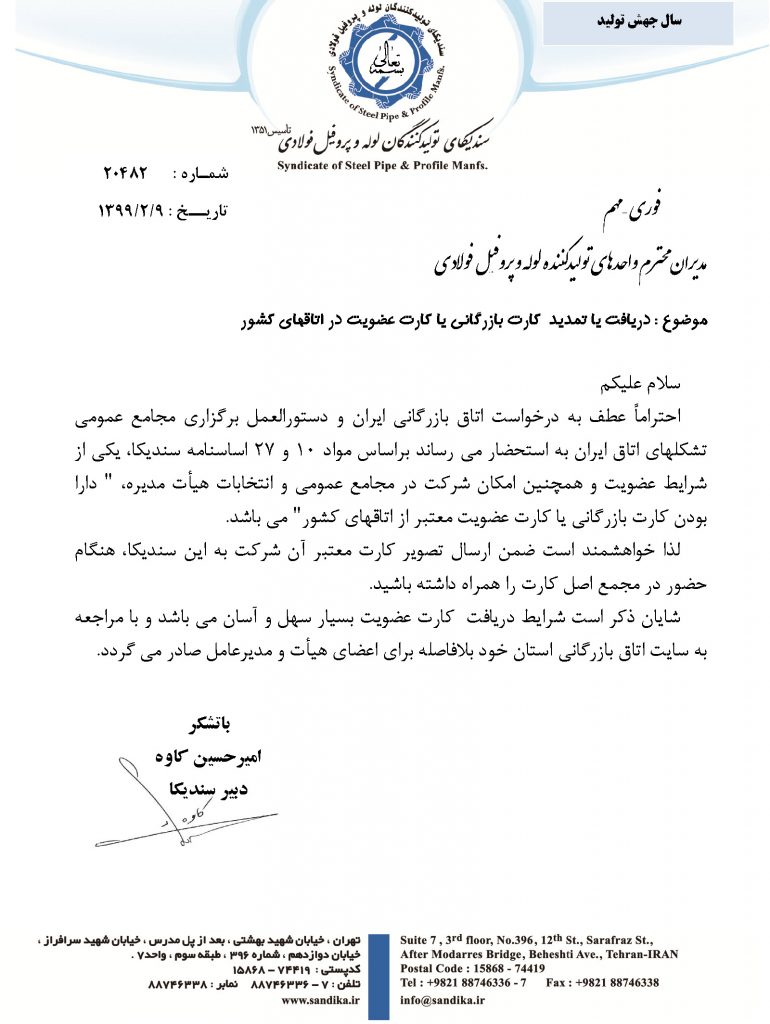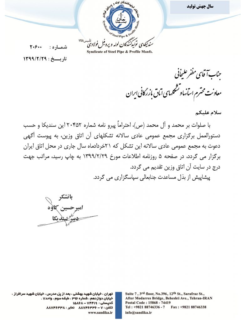 رونوشت : جناب آقای علیخانی، معاونت محترم تشکلهای اتاق بازرگانی ایران جهت استحضار و معرفی نماینده جهت حضور در مجمع عمومی سندیکا.