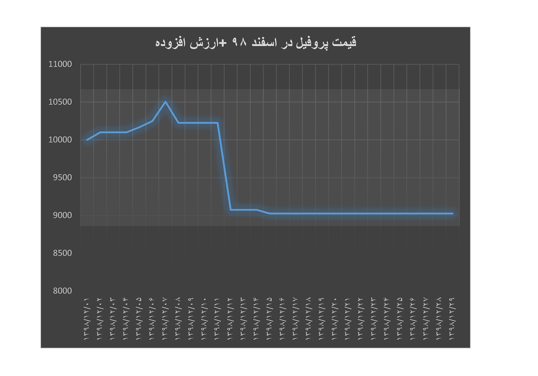 جدول هفتگی قیمت ها / زنجیره فولاد ۰۵ فروردین ۱۳۹۹ شناسه خبر : 7280 نمودار قیمت پروفیل فولادی ۲ میل طی اسفند ماه ۹۸ با احتساب ۹% مالیات بر ارزش افزوده