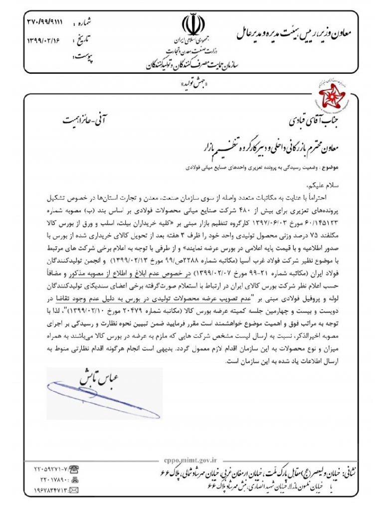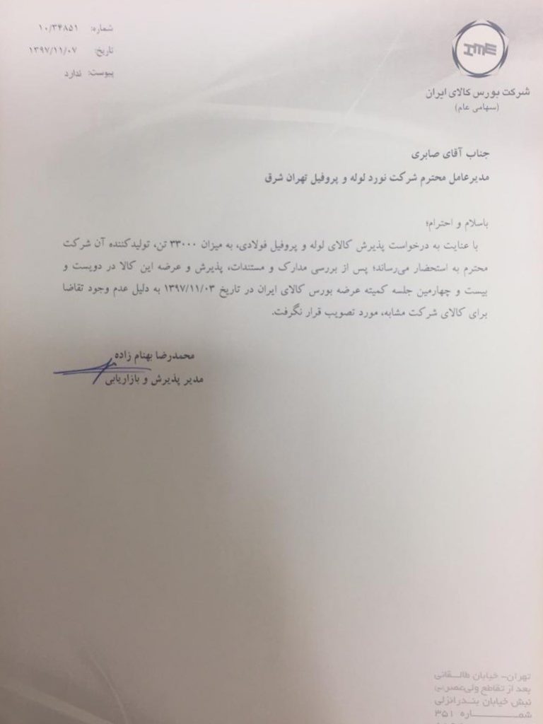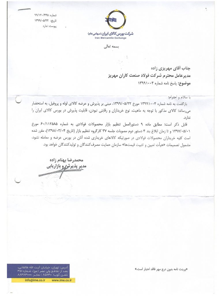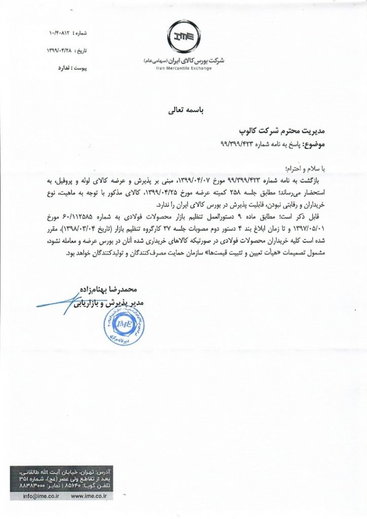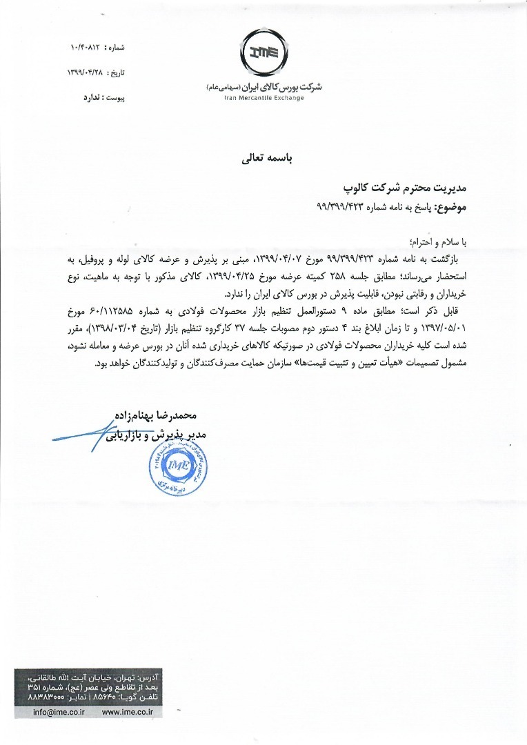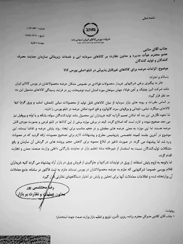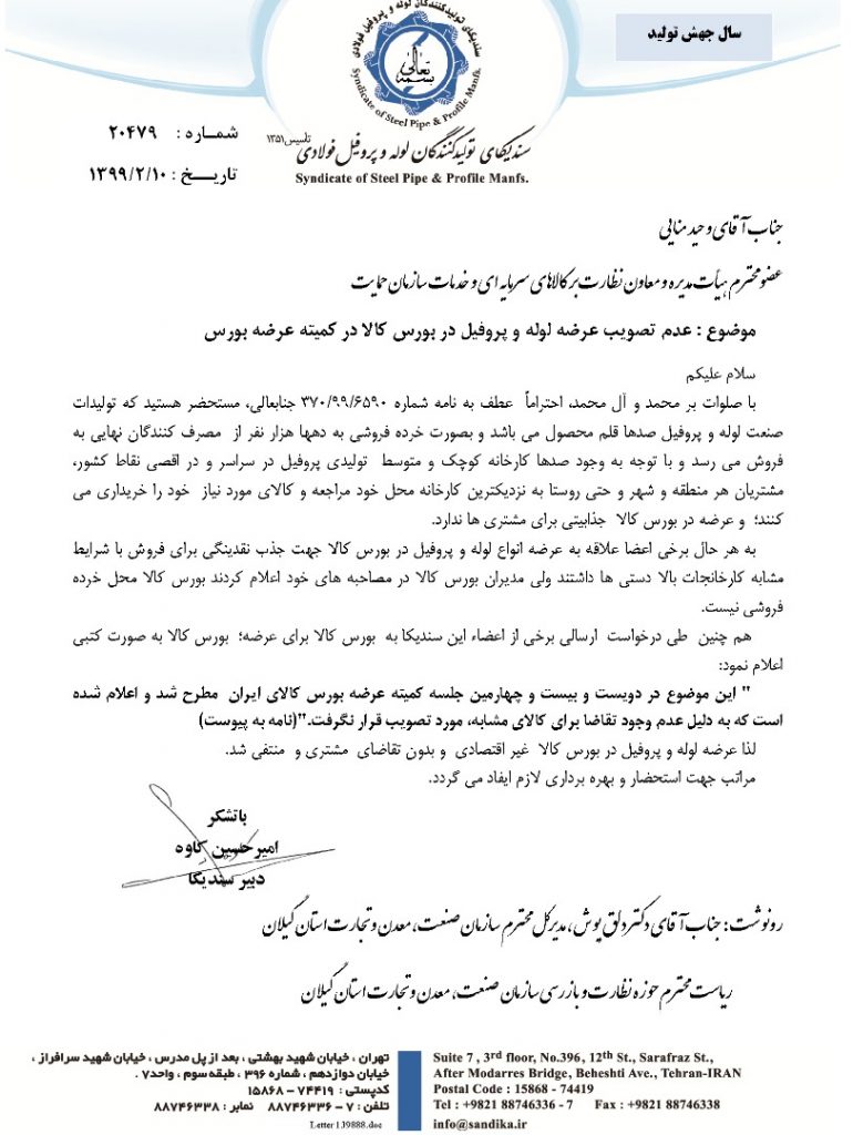پیشخوان / خبرهای روابط عمومی / زنجیره فولاد / سازمان بورس و اوراق بهادار ۰۸ تیر ۱۳۹۹ شناسه خبر : 7305 عدم تصویب عرضه لوله و پروفیل در کمیته عرضه بورس + پیوست نامه سازمان حمایت و بورس