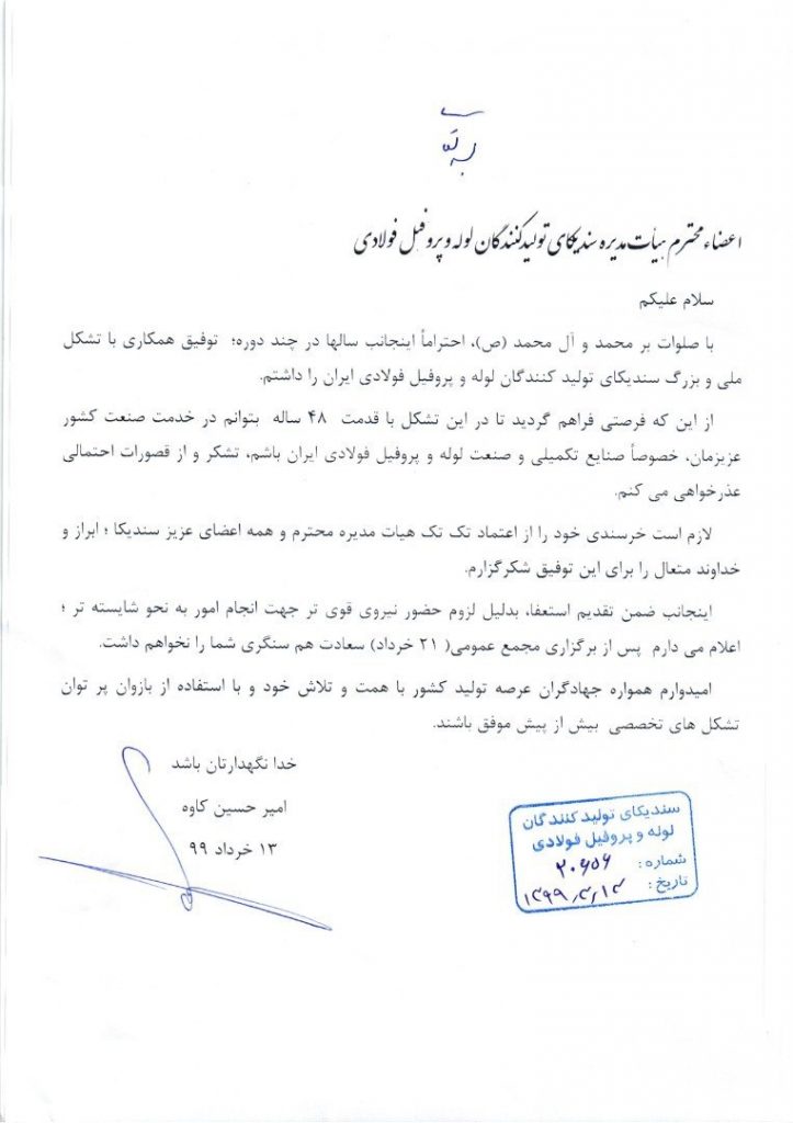 باصلوات بر محمد و آل محمد؛ احتراما مستحضرید اینجانب سالها در چند دوره؛ توفیق همکاری با تشکل ملی و بزرگ سندیکای تولید کنندگان لوله و پروفیل فولادی ایران را داشتم.
