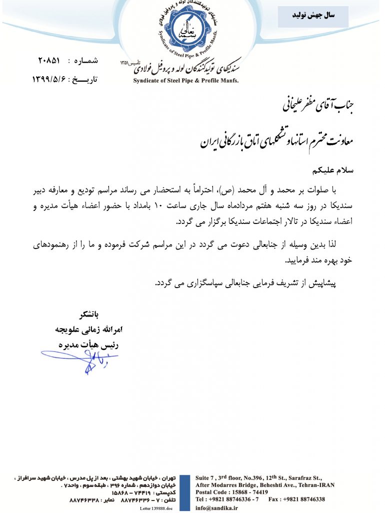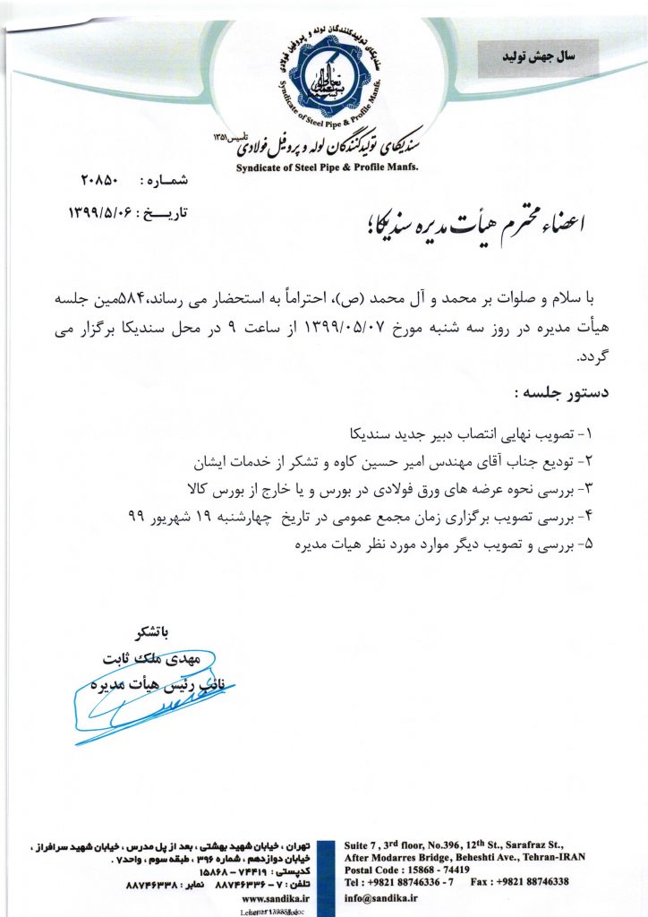 با سلام و صلوات بر محمد و آل محمد (ص)، احتراماً به استحضار می رساند،۵۸۴مین جلسه هیأت مدیره در روز سه شنبه مورخ ۰۷/۰۵/۱۳۹۹ از ساعت ۹ در محل سندیکا برگزار می گردد.