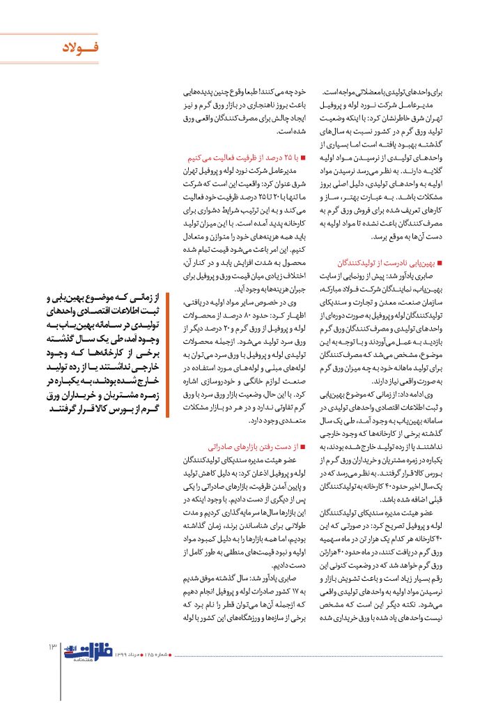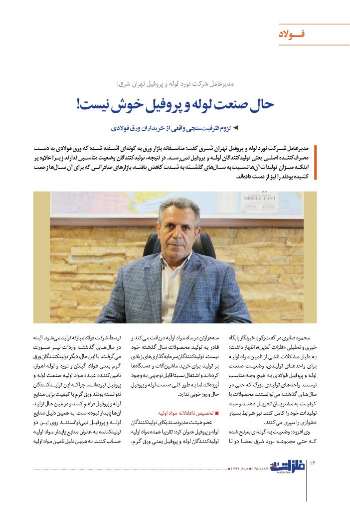 خبرهای روابط عمومی / زنجیره فولاد / مصاحبه های هیات مدیره سندیکا / هیأت مدیره ۱۴ مرداد ۱۳۹۹ شناسه خبر : 7440 حال صنعت لوله و پروفیل خوش نیست! / لزوم ظرفیت سنجی واقعی از خریداران ورق فولادی