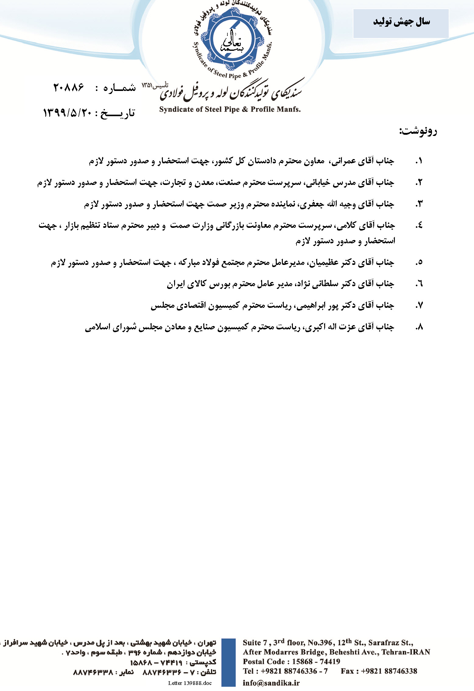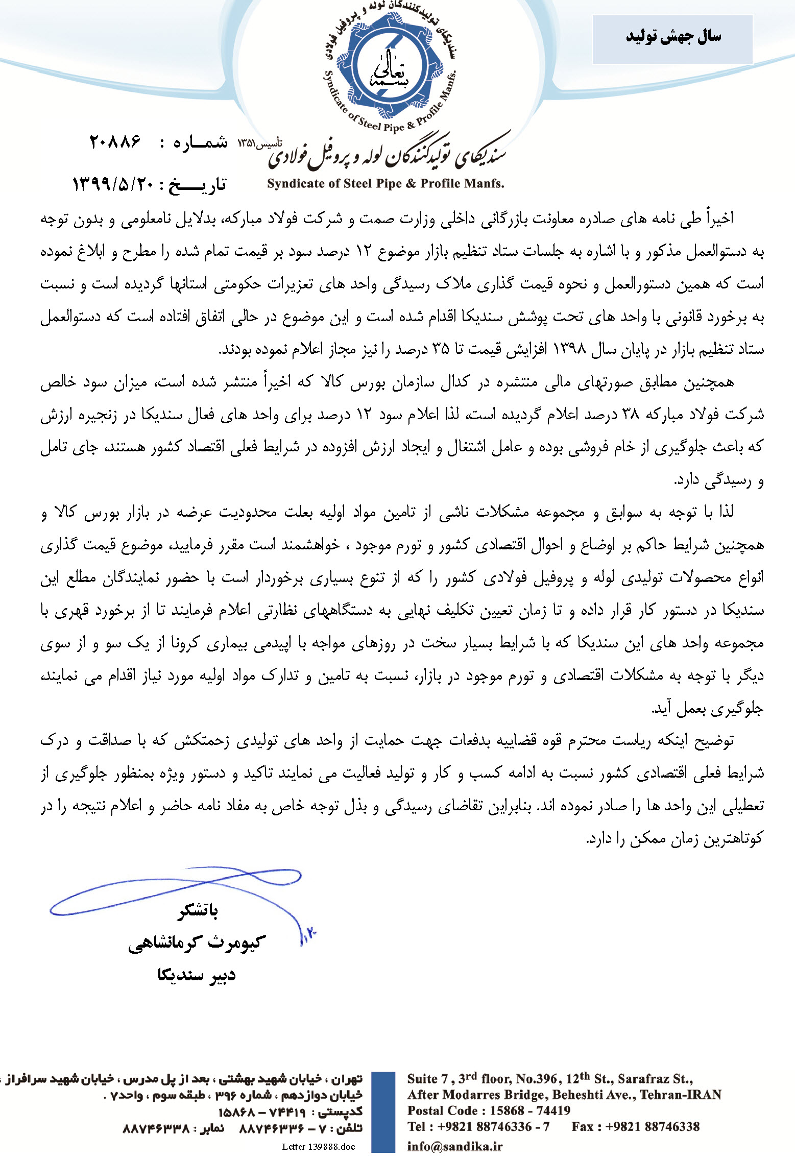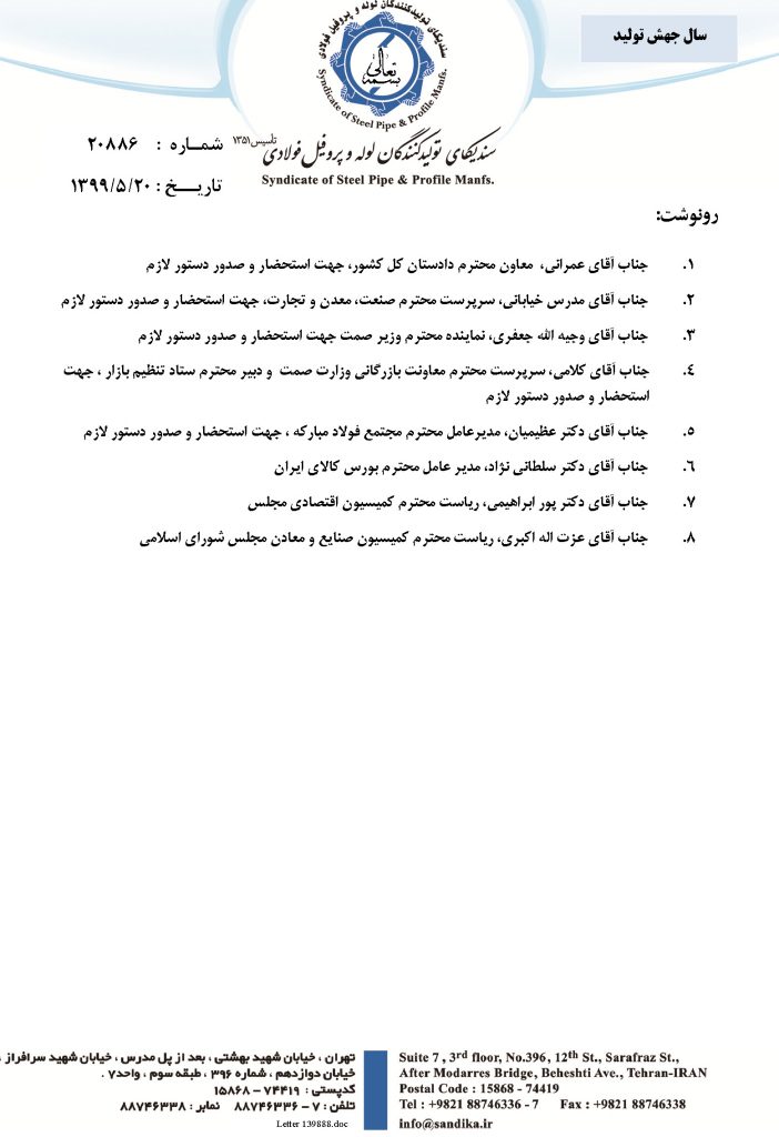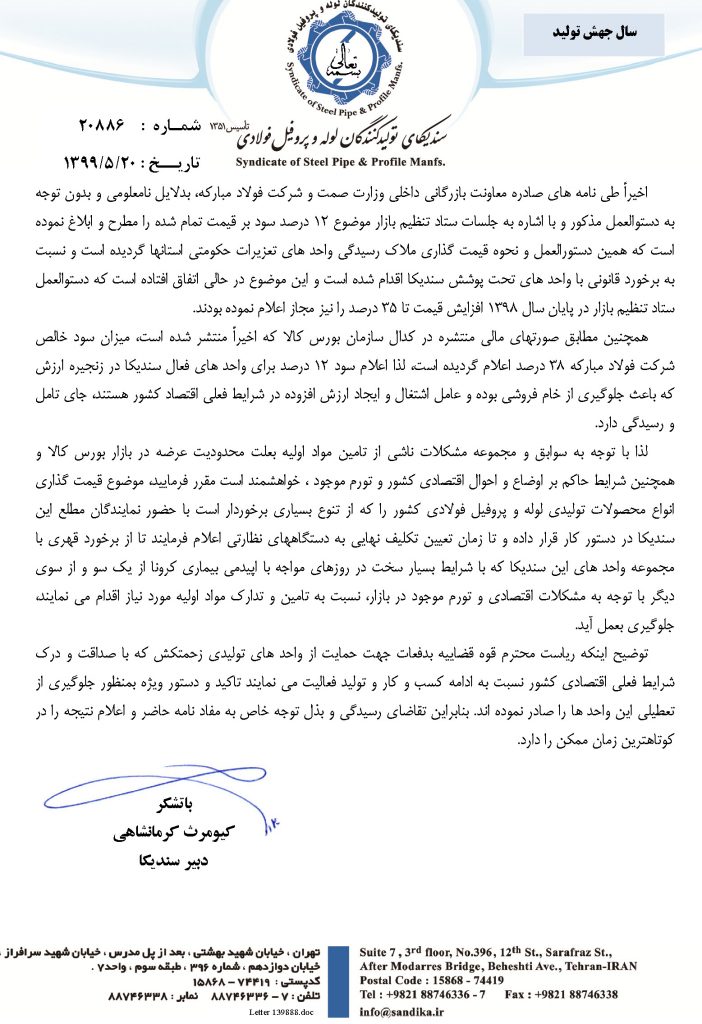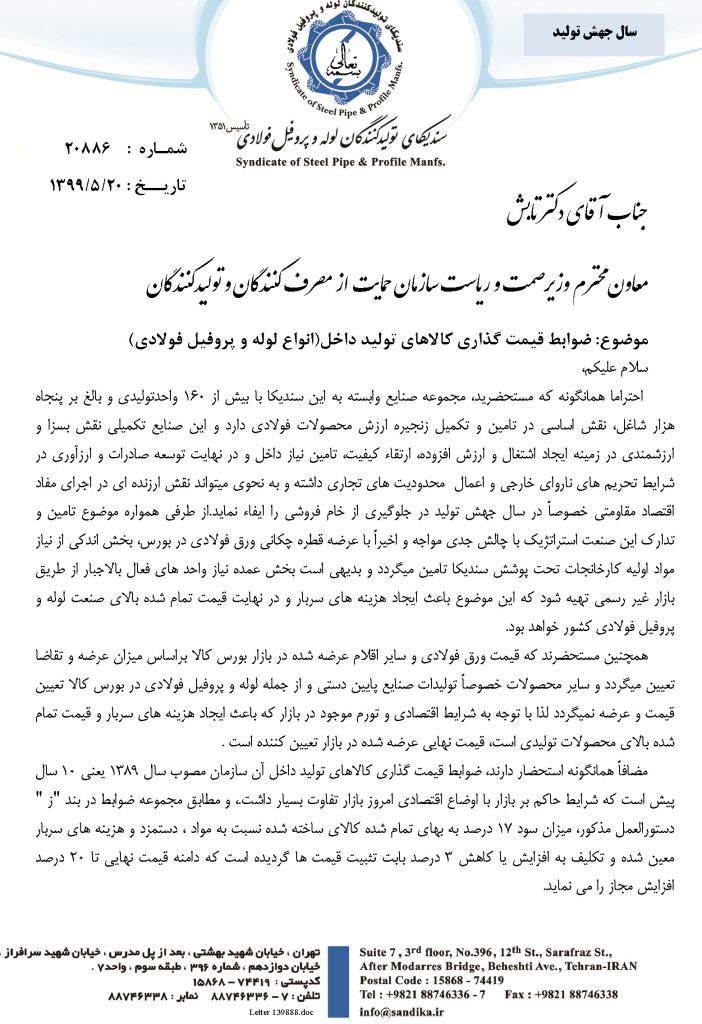 لذا با توجه به سوابق و مجموعه مشکلات ناشی از تامین مواد اولیه بعلت محدودیت عرضه در بازار بورس کالا و همچنین شرایط حاکم بر اوضاع و احوال اقتصادی کشور و تورم موجود ، خواهشمند است مقرر فرمایید، موضوع قیمت گذاری انواع محصولات تولیدی لوله و پروفیل فولادی کشور را که از تنوع بسیاری برخوردار است با حضور نمایندگان مطلع این سندیکا در دستور کار قرار داده و تا زمان تعیین تکلیف نهایی به دستگاههای نظارتی اعلام فرمایند تا از برخورد قهری با مجموعه واحد های این سندیکا که با شرایط بسیار سخت در روزهای مواجه با اپیدمی بیماری کرونا از یک سو و از سوی دیگر با توجه به مشکلات اقتصادی و تورم موجود در بازار، نسبت به تامین و تدارک مواد اولیه مورد نیاز اقدام می نمایند، جلوگیری بعمل آید.