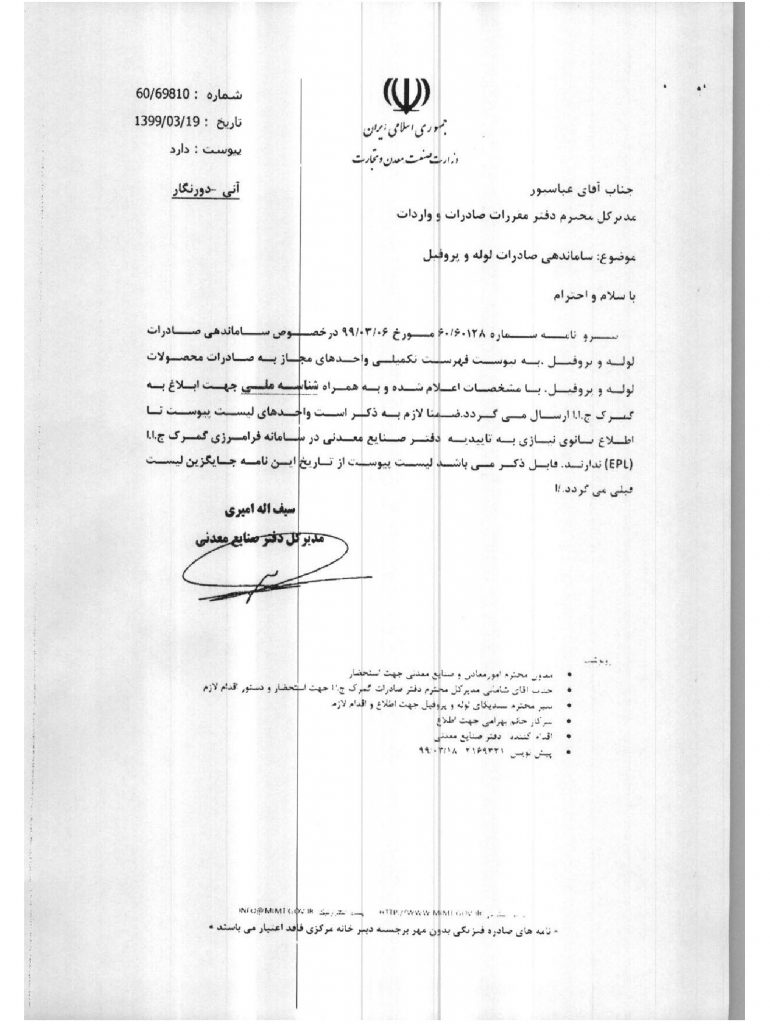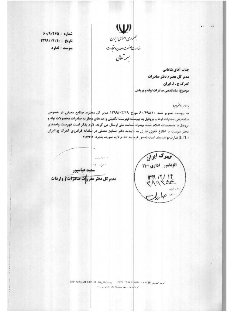 پیشخوان / زنجیره فولاد / ضوابط تجاری و صنعتی / گزارش / گوناگون / نامه های مهم ۲۴ مرداد ۱۳۹۹ شناسه خبر : 7467 جدیدترین لیست دارندگان مجوز صادراتی لوله و پروفیل فولادی در تیرماه ۹۹ ۴_۵۷۷۱۵۸۶۹۳۵۰۸۴۵۴۹۵۴۸ ۴_۵۷۷۱۵۸۶۹۳۵۰۸۴۵۴۹۵۴۸