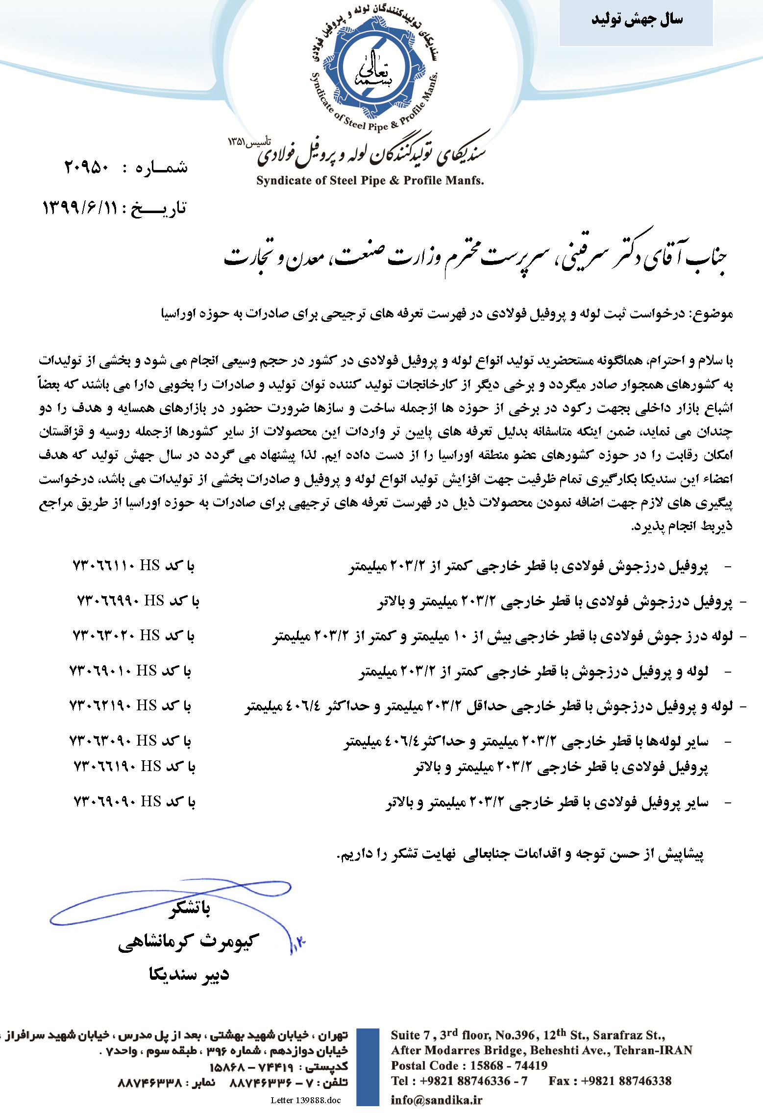 با سلام و احترام، همانگونه مستحضرید تولید انواع لوله و پروفیل فولادی در کشور در حجم وسیعی انجام می شود و بخشی از تولیدات به کشورهای همجوار صادر میگردد و برخی دیگر از کارخانجات تولید کننده توان تولید و صادرات را بخوبی دارا می باشند که بعضاً اشباع بازار داخلی بجهت رکود در برخی از حوزه ها ازجمله ساخت و سازها ضرورت حضور در بازارهای همسایه و هدف را دو چندان می نماید، ضمن اینکه متاسفانه بدلیل تعرفه های پایین تر واردات این محصولات از سایر کشورها ازجمله روسیه و قزاقستان امکان رقابت را در حوزه کشورهای عضو منطقه اوراسیا را از دست داده ایم. لذا پیشنهاد می گردد در سال جهش تولید که هدف اعضاء این سندیکا بکارگیری تمام ظرفیت جهت افزایش تولید انواع لوله و پروفیل و صادرات بخشی از تولیدات می باشد، درخواست پیگیری های لازم جهت اضافه نمودن محصولات ذیل در فهرست تعرفه های ترجیهی برای صادرات به حوزه اوراسیا از طریق مراجع ذیربط انجام پذیرد.