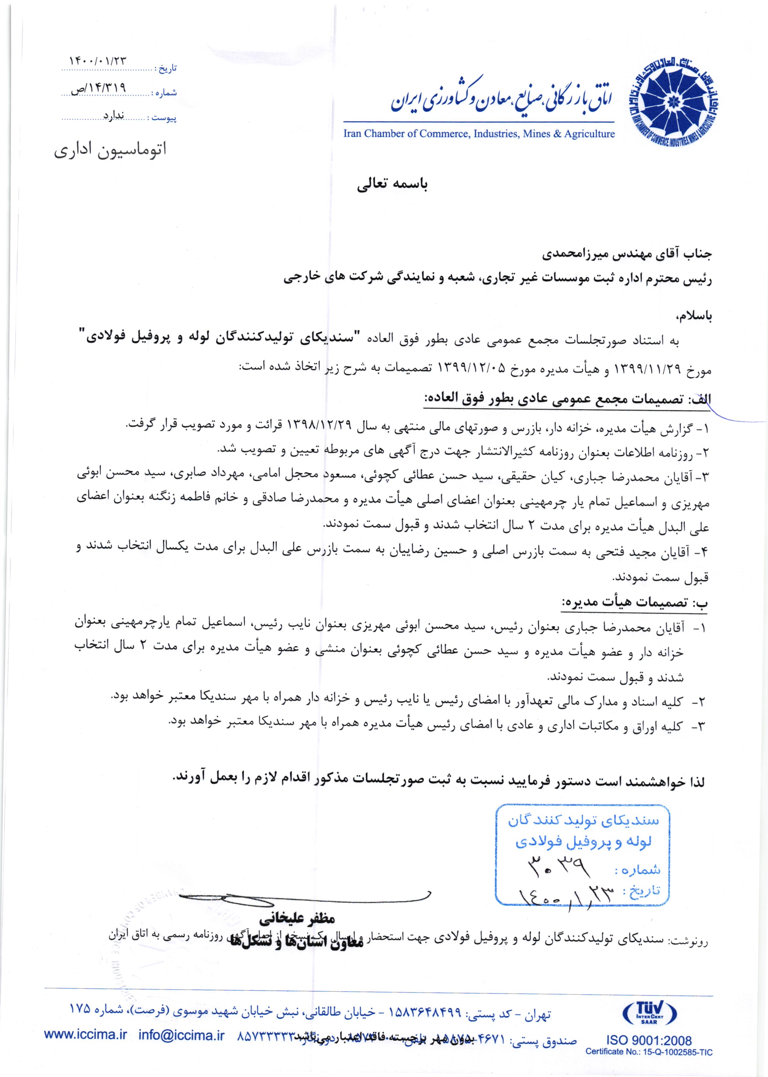 ۳- مقرر شد جهت بررسی عرضه صحیح و تعیین قیمت پایه متعارف شرکت های فولادی با مسولین بورس کالا جلسه ای برگزار گردد.