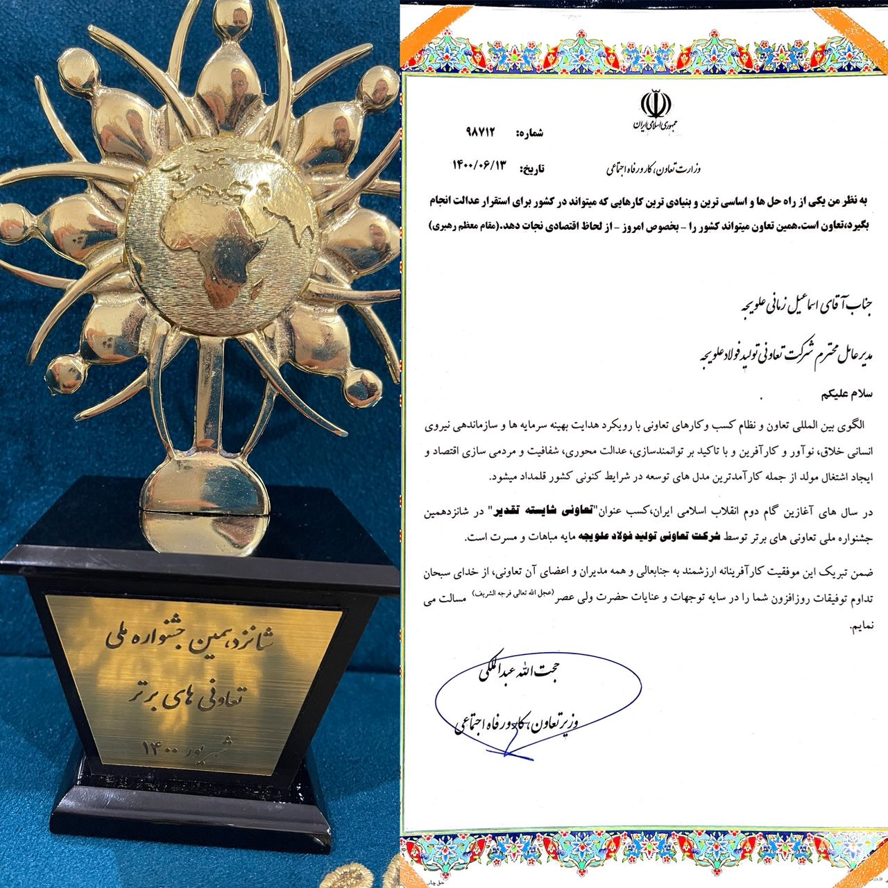 با حضور حجت عبدالملکی وزیر تعاون، کار و رفاه اجتماعی، مراسم تجلیل از تعاونی های برتر ملی وتعاونی فولاد علویجه، ۱۶ شهریور ۱۴۰۰ برگزار شد.