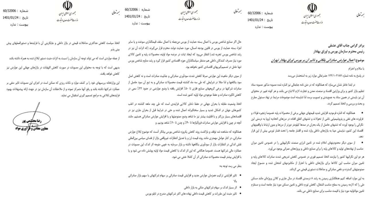 نامه های مهم / نامه های وارده ۲۴ فروردین ۱۴۰۱ شناسه خبر : 8686 اعمال عوارض صادراتی پلکانی وتاثیرات آن بر بورس اوراق بهادار تهران