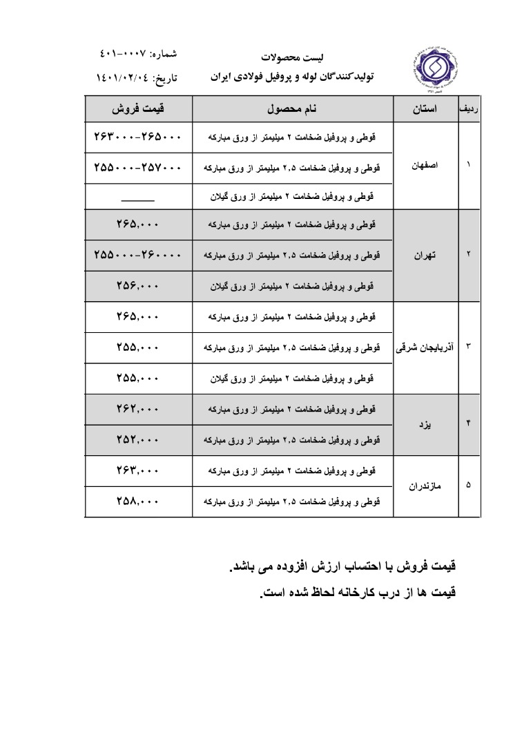 قیمت محصولات در چهارم اردیبهشت ماه ۱۴۰۱