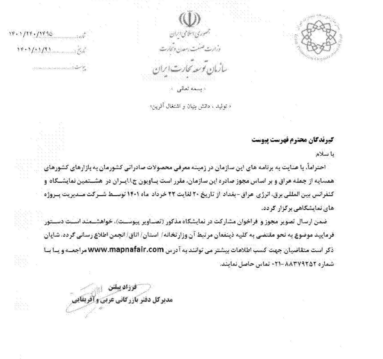 نامه های وارده / نمایشگاه ۰۵ اردیبهشت ۱۴۰۱ شناسه خبر : 8741 ۵۰۴۸ هشتمین نمایشگاه و کنفرانس بین المللی برق و انرژی عراق بغداد