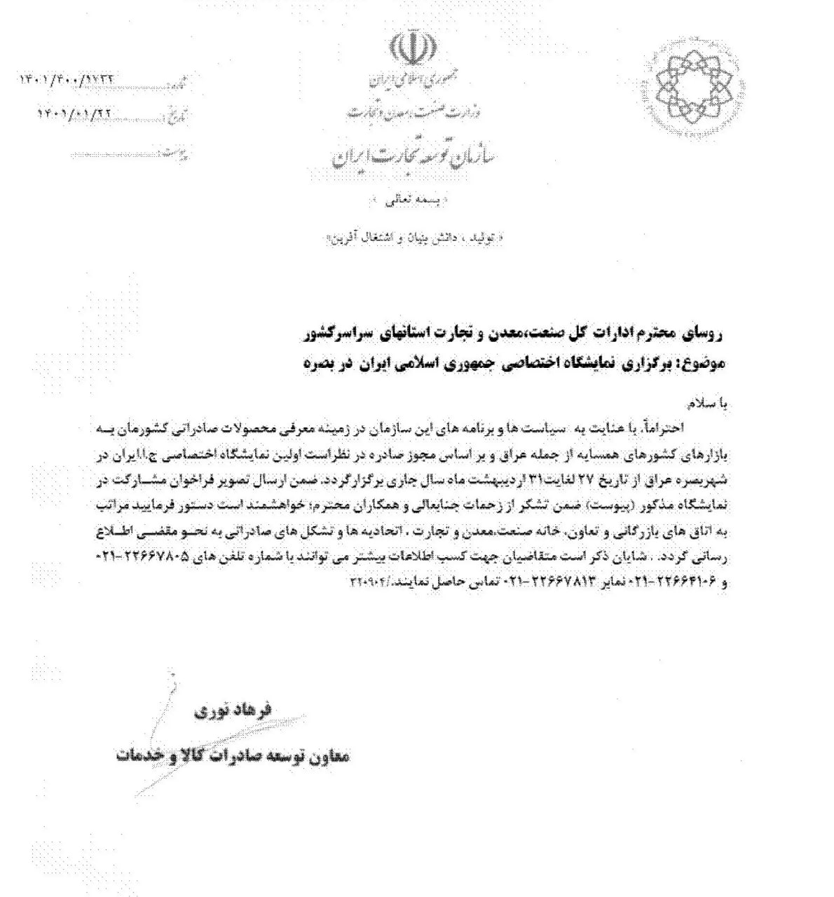به اطلاع می رساند گروه بازرگانی و نمایشگاهی تعاونی کارکنان سازمان توسعه تجارت ( ایتوک ) با مجوز رسمی سازمان توسعه تجارت ایران در نظر دارد نمایشگاه اختصاصی ج. ا. ایران را از تاریخ ۲۷لغایت ۳۱اردیبهشت ماه سال جاری در مرکز نمایشگاهی بصره – عراق برگزار نماید.
