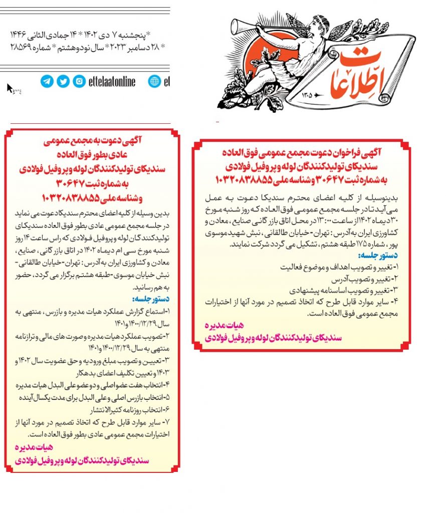 باسلام و احترام، ضمن ارسال آگهی های دعوت به مجامع عمومی فوق العاده و عادی بطور فوق العاده مندرج در صفحه۷ روزنامه اطلاعات مورخ ۷/۱۰/۱۴۰۲ به استحضار میرساند برابر مصوبه هیأت مدیره محترم سندیکا، جلسه مجامع عمومی فوق العاده و عادی بطور فوق العاده سندیکا در روز شنبه سی ام دیماه ۱۴۰۲ از ساعت ۱۳ الی ۱۷ با دستور جلسه های آتیالذکر در ساختمان اتاق بازرگانی صنایع معادن و کشاورزی ایران طبقه هشتم برگزار خواهد شد.