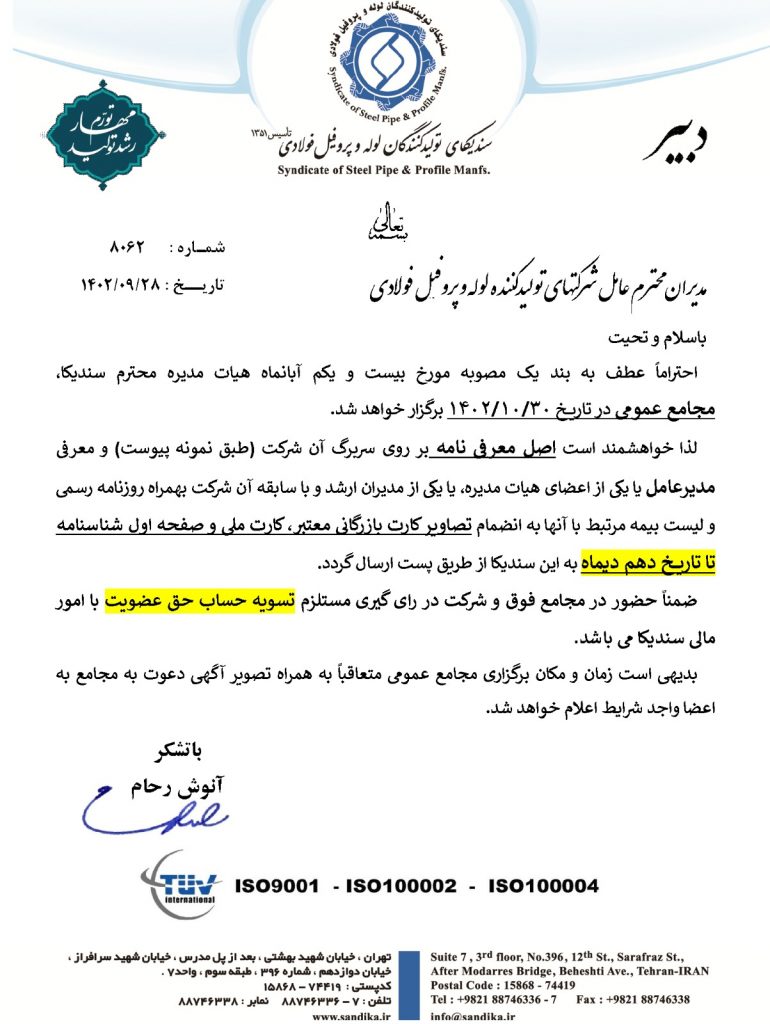 دبیر محترم سندیکای تولیدکنندگان لوله و پروفیل فولادی