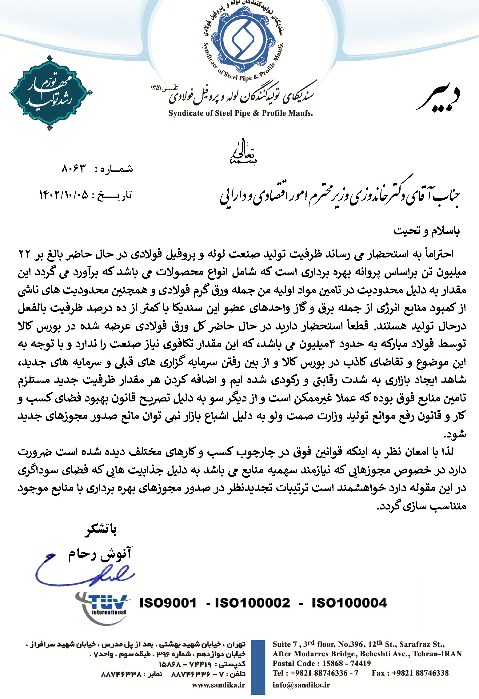 احتراماً به استحضار می رساند ظرفیت تولید صنعت لوله و پروفیل فولادی در حال حاضر بالغ بر ۲۲ میلیون تن براساس پروانه بهره برداری است که شامل انواع محصولات می باشد که برآورد می گردد این مقدار به دلیل محدودیت در تامین مواد اولیه من جمله ورق گرم فولادی و همچنین محدودیت های ناشی از کمبود منابع انرژی از جمله برق و گاز واحدهای عضو این سندیکا با کمتر از ده درصد ظرفیت بالفعل درحال تولید هستند. قطعاً استحضار دارید در حال حاضر کل ورق فولادی عرضه شده در بورس کالا توسط فولاد مبارکه به حدود ۴میلیون می باشد، که این مقدار تکافوی نیاز صنعت را ندارد و با توجه به این موضوع و تقاضای کاذب در بورس کالا و از بین رفتن سرمایه گزاری های قبلی و سرمایه های جدید، شاهد ایجاد بازاری به شدت رقابتی و رکودی شده ایم و اضافه کردن هر مقدار ظرفیت جدید مستلزم تامین منابع فوق بوده که عملا غیرممکن است و از دیگر سو به دلیل تصریح قانون بهبود فضای کسب و کار و قانون رفع موانع تولید وزارت صمت ولو به دلیل اشباع بازار نمی توان مانع صدور مجوزهای جدید شود.