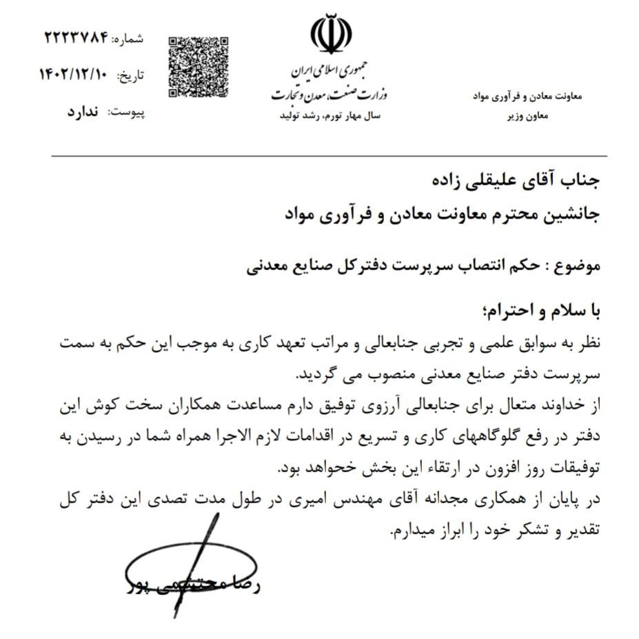 تقدیر و تجلیل و انتخاب / نامه های مهم / نامه های وارده / وزارت صنعت ۱۰ اسفند ۱۴۰۲ شناسه خبر : 9499 از آقای امیری تقدیر و تشکر بعمل آمد آقای علی قلی زاده سرپرست دفتر کل صنایع معدنی شد