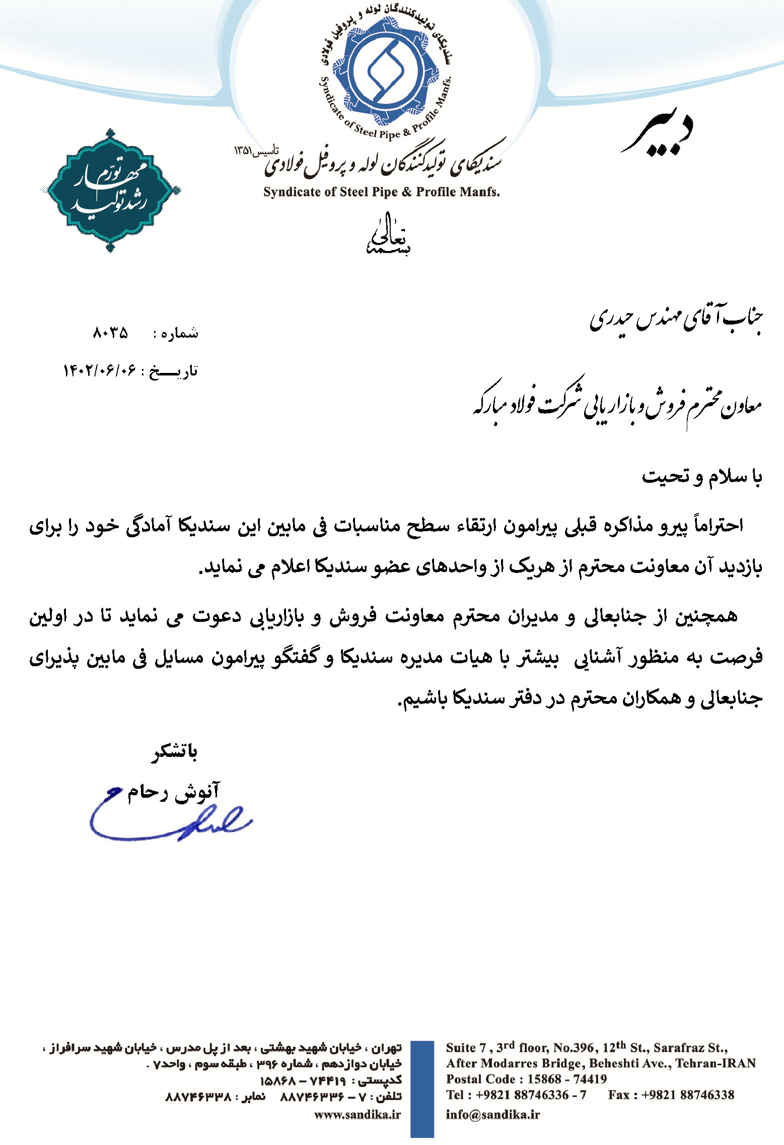 احتراماً پیرو مذاکره قبلی پیرامون ارتقاء سطح مناسبات فی مابین این سندیکا آمادگی خود را برای بازدید آن معاونت محترم از هریک از واحدهای عضو سندیکا اعلام می نماید.