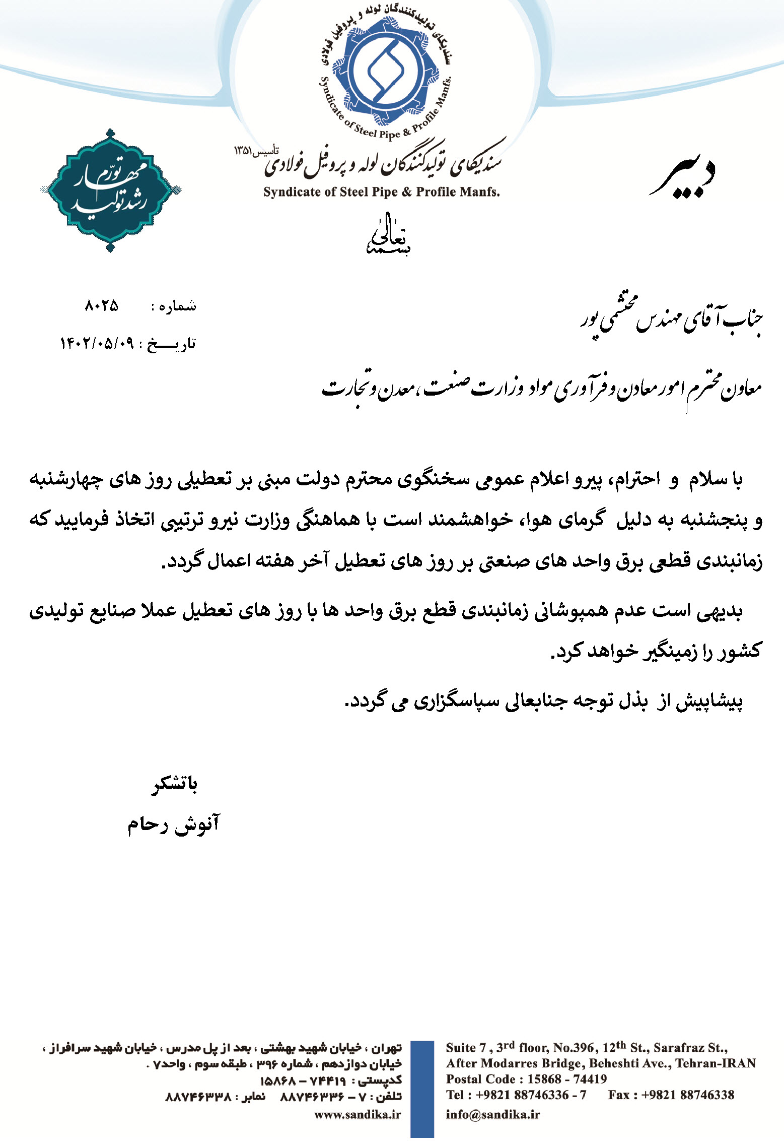 با سلام و احترام، پیرو اعلام عمومی سخنگوی محترم دولت مبنی بر تعطیلی روز های چهارشنبه و پنجشنبه به دلیل گرمای هوا، خواهشمند است با هماهنگی وزارت نیرو ترتیبی اتخاذ فرمایید که زمانبندی قطعی برق واحد های صنعتی بر روز های تعطیل آخر هفته اعمال گردد.