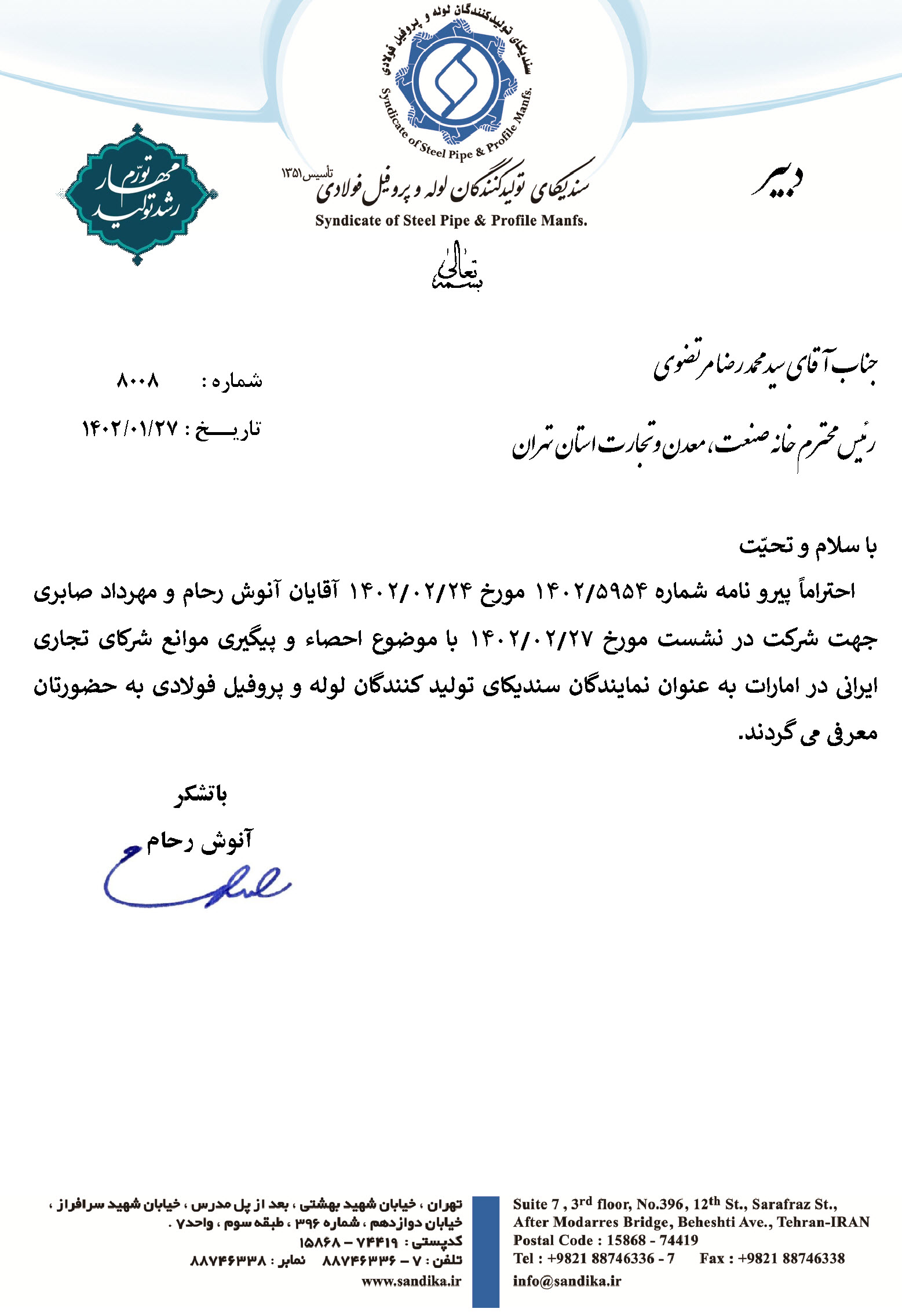 احتراماً پیرو نامه شماره ۵۹۵۴/۱۴۰۲ مورخ ۲۴/۰۲/۱۴۰۲ آقایان آنوش رحام و مهرداد صابری جهت شرکت در نشست مورخ ۲۷/۰۲/۱۴۰۲ با موضوع احصاء و پیگیری موانع شرکای تجاری ایرانی در امارات به عنوان نمایندگان سندیکای تولید کنندگان لوله و پروفیل فولادی به حضورتان معرفی می گردند.